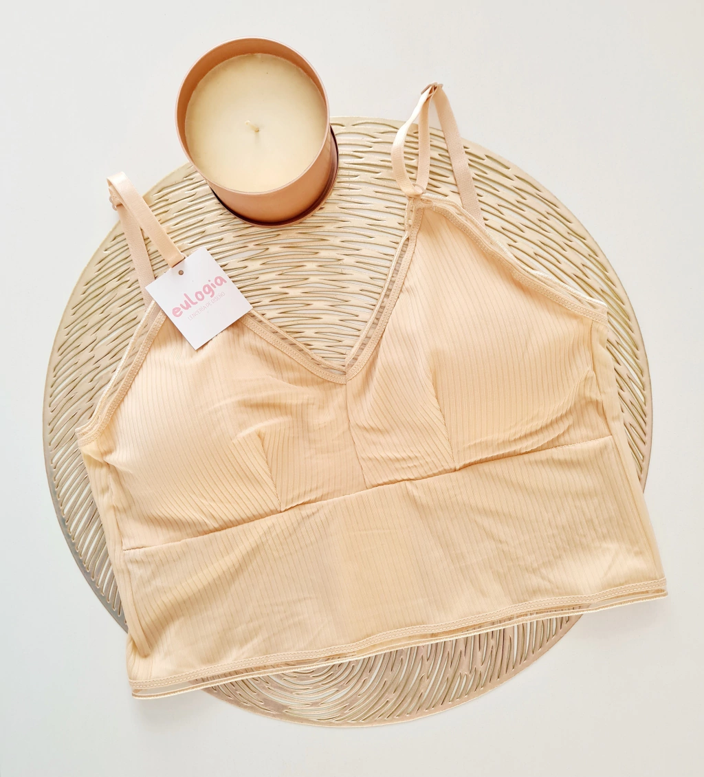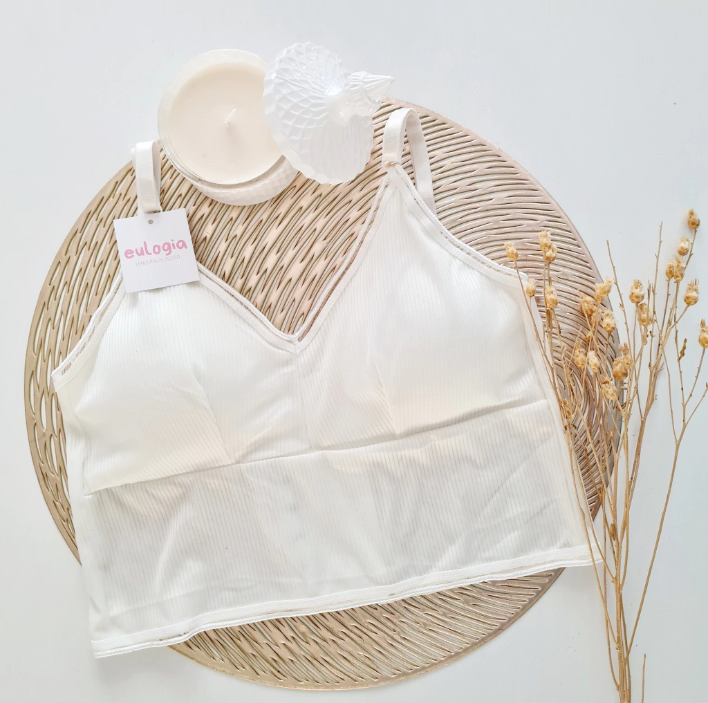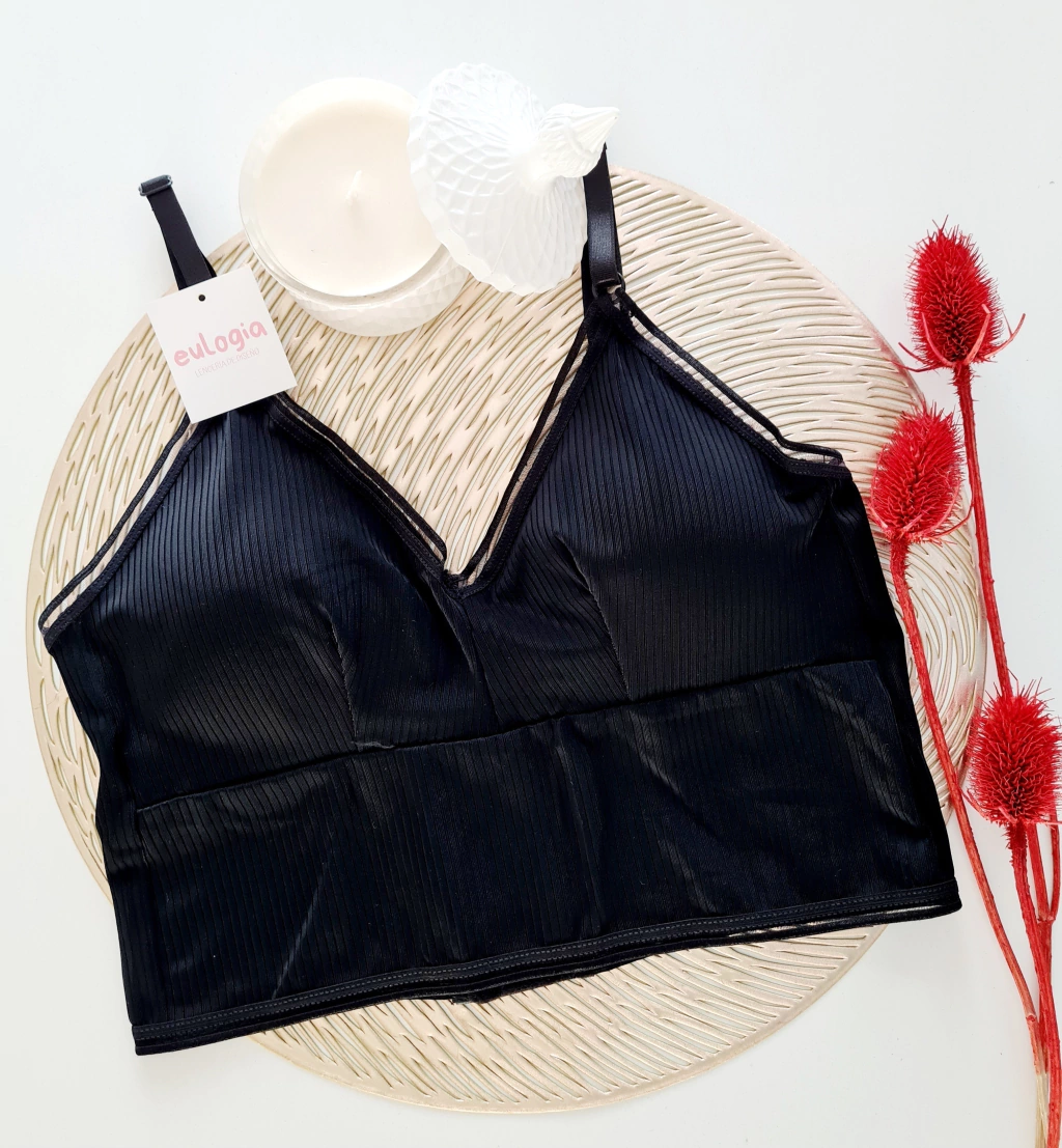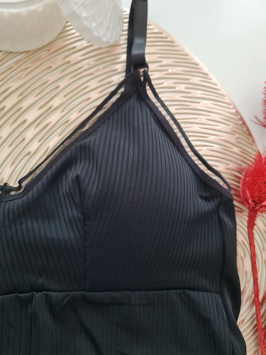 - Top con bajobusto ancho de 10 cm y tazas desmontables. Con ganchos en la espalda para regularla en 3 posiciones. Breteles regulables y avios hipoalergenicos. E